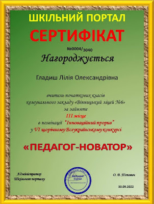 Шкільна родина Вінницького ліцею №6 вітає Гладиш Лілію Олександрівну із переможним місцем у VI Всеукраїнському конкурсі "Педагог-новатор" у номінації "Інноваційний прорив".🥇